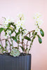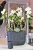 A multi-stemmed arrangement showcasing gorgeous white dendrobium orchids presented in a big and beautiful black ceramic vase adorned with succulent and black rocks. In the language of flowers, white orchids represent respect, appreciation, and gratitude, making this piece a perfect gift for many special occasions.