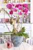 Let this enchanting floral creation transport you into your dream paradise. It features beautiful Phalaenopsis orchids with large, showy flowers bursting in blissful pink color. This design combines three orchid plants artfully adorned with kiwi branches, driftwood, air plants, and moss, with each stem supported by bamboo. An impressive gift for all occasions, this magnificent piece is presented in a large unpolished pot with a gorgeous ash-gray color.
