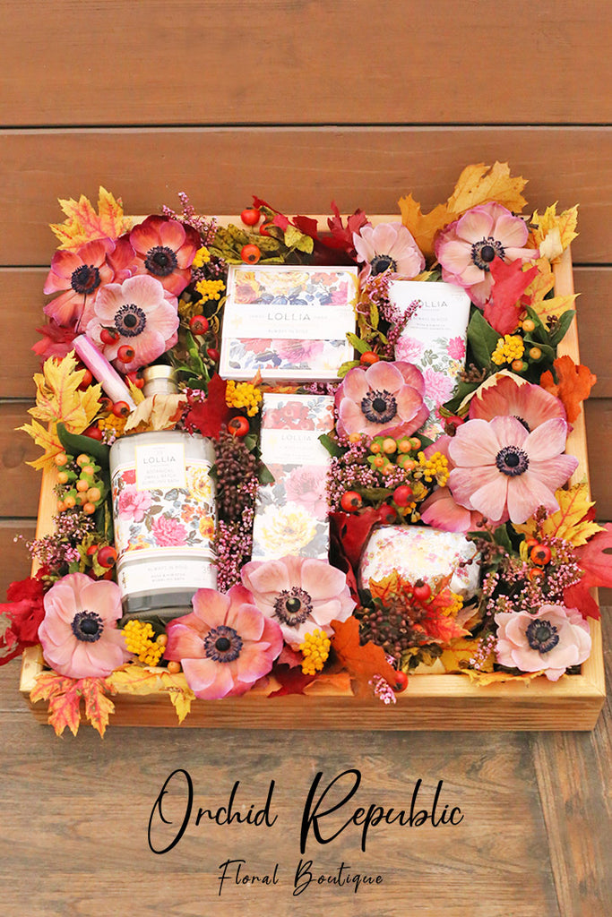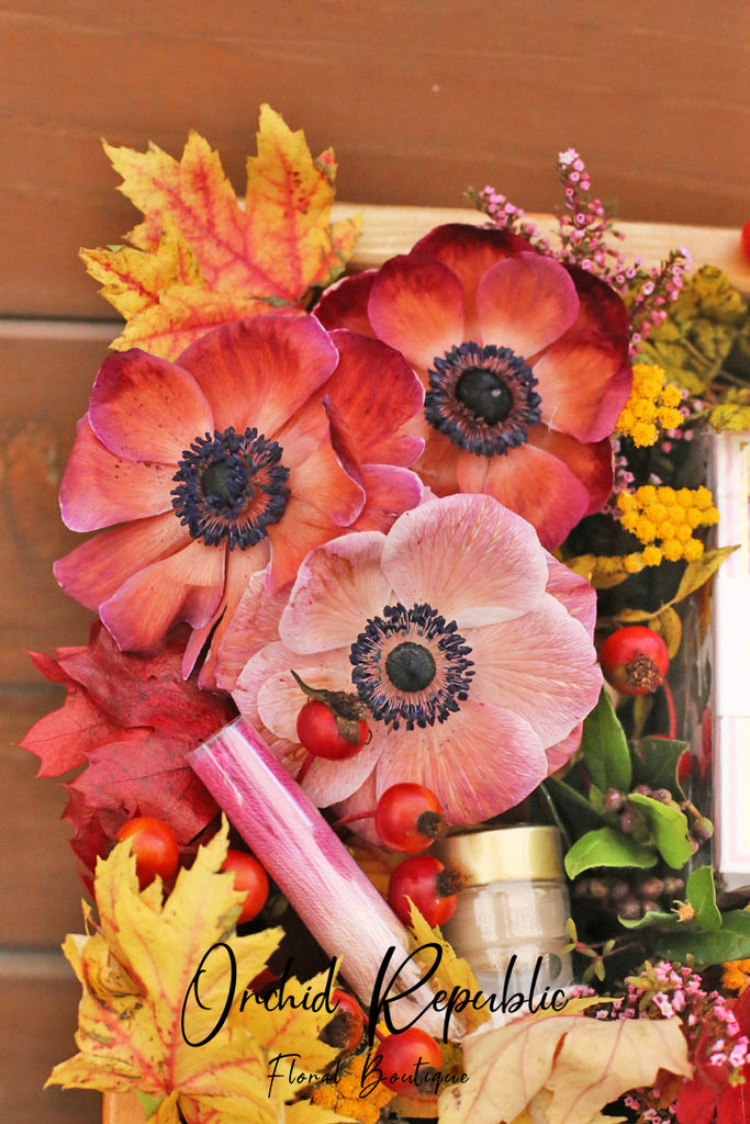 A captivating fall-inspired gift featuring a handmade wooden box adorned with anemones, hypericum berries, and autumn leaves in touch of red and gold.