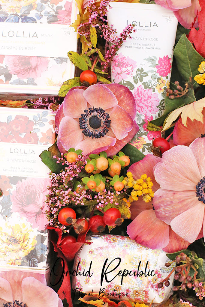 This gorgeous floral gift box bears thoughtful self-care presents from Lollia, a meticulously crafted brand of small batch perfumery by Margot Elena. It includes: