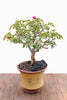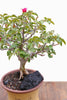 A stunning bougainvillea bonsai, meticulously cultivated to showcase its vibrant potential. This arrangement features a beautifully gnarled trunk and a flourishing canopy of lush green leaves, hinting at the spectacular magenta bracts that will erupt in a breathtaking display of color. Potted in an elegant ceramic pot with traditional calligraphy, and accented with natural lava rock, perfect for adding a touch of serene sophistication to any indoor or outdoor space.