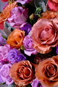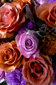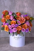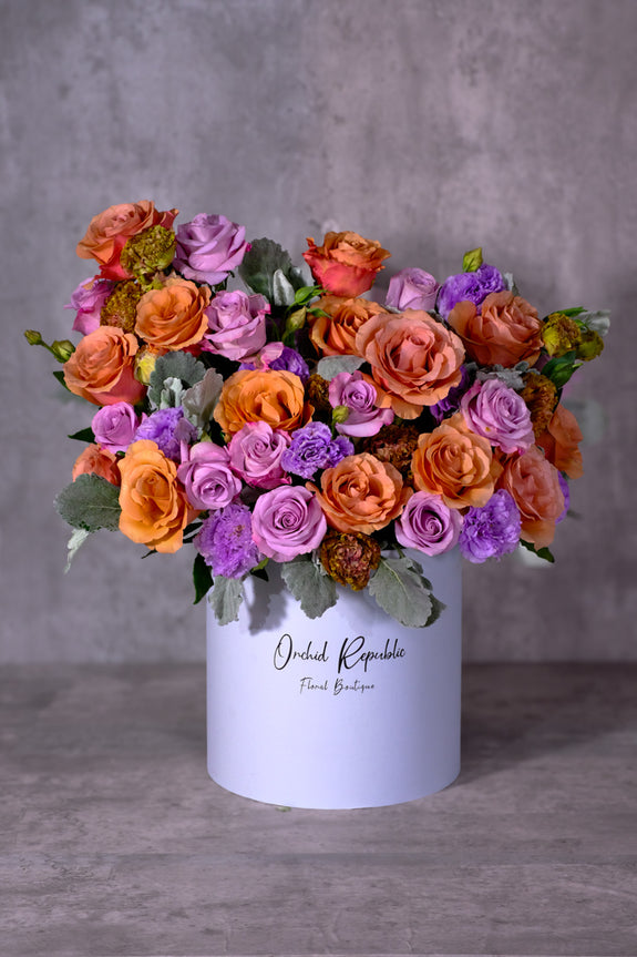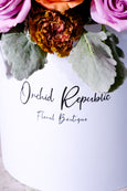 Celebrate life’s cherished moments with this enchanting floral arrangement. A bold display that blends charm and sentiment. It showcases lavender pink roses alongside rich purple and sienna lisianthus. Their colors are enhanced by the warm and inviting tones of mochaccino and caramel macchiato roses. All of this is housed in our chic signature hat box that can be kept as a memento after your blooms have faded.