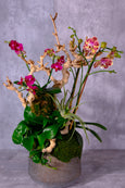 Delight in this mesmerizing orchid arrangement that’s full of personality. Featuring strawberry lemonade-hued double medium orchids alongside playful hot pink baby orchids, this piece burst with sassy energy. A large air plant and natural wood anchors the arrangement, while lush moss and glossy greenery balances it out. This piece also has bamboo sticks to support the stems of the plants and comes in a stone finish ceramic vase. Named after the Portuguese word for “delight,” it can be a great piece to brighten anyone’s day.