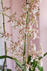 A vision of delicate beauty featuring speckled Spire Oncidium orchids. Its slender stem is adorned with petite, light-hued blossoms that cascade gracefully like a soft floral veil. Emerald foliage adds depth and contrast, while a bed of rich moss grounds the arrangement, enhancing its natural elegance. This ethereal orchid arrangement is supported by a clear midollino stick and is planted in a white ceramic vase with an abstract design.