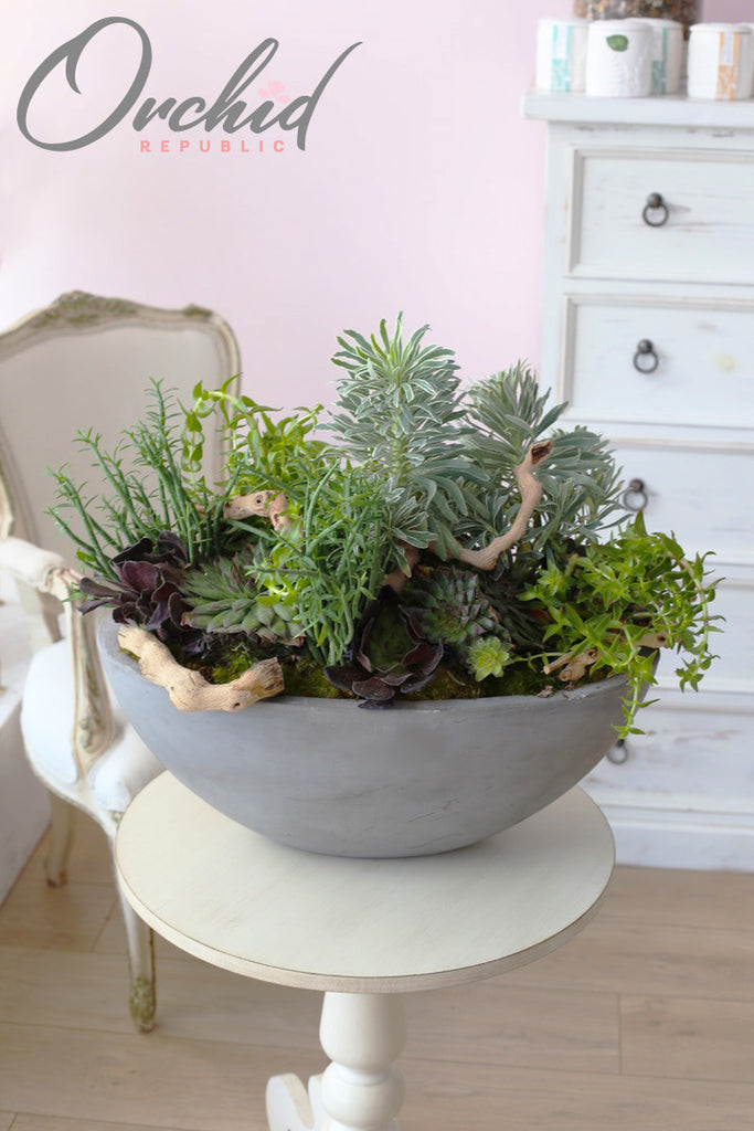 Featuring an array of stunning shades of green hues and wonderful textures, this pocket paradise beautifully thrives with an assortment of hardy plants and succulents. Nestled in a large elegant planter it is adorned with wooden branches and moss for ground cover, and filled with optimal potting material for effortless upkeep.