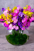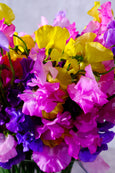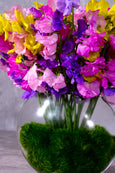 A floral party that combines playfulness and delicate beauty. This cheerful floral arrangement bursts forth with an electrifying mix of sunny yellow, intense purple, and pretty shades of pink sweet peas, creating a confetti-like effect that is sure to lift your spirits. Adding subtle texture are delicate sprigs of dianthus, enhancing the overall charm and fullness of the arrangement. Nestled in a clear glass vase with a bed of lush greens at the base.