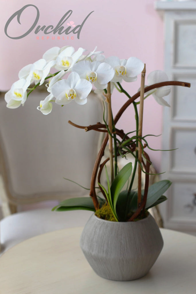 A sophisticated orchid arrangement featuring a captivating cascade of classic white phalaenopsis orchids blooming. This two-stemmed orchid plant is adorned with natural wood, a verdant Tillandsia, or air plant variety, supported with bamboo-like stakes, and is nestled in an elegant vase with moss for ground cover. Inside, it is filled with optimal potting material for effortless upkeep.