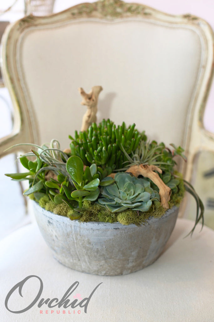 A little paradise of vibrancy and texture featuring a variety of succulents, including Echeveria and two Crassula ovata varieties (jade plant and Hobbit jade), interesting air plants, and a piece of birchwood for an added touch of nature. This stunning succulent arrangement is presented in an elegant stone planter filled with moss and an appropriate potting mix for effortless upkeep.