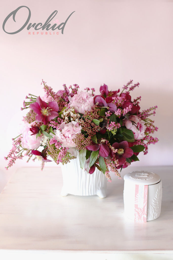 Dazzling hues of mauve and blush mixing dreamily through the delicate petals of fancy blooms. This garden-inspired flower arrangement boasts of large baby pink peonies, hellebores in marsala, and sprigs of rice flowers and astilbe. A wonderful floral gift and centerpiece, it comes in a chic ceramic vase.