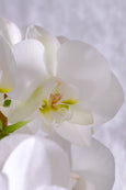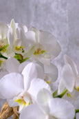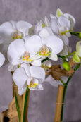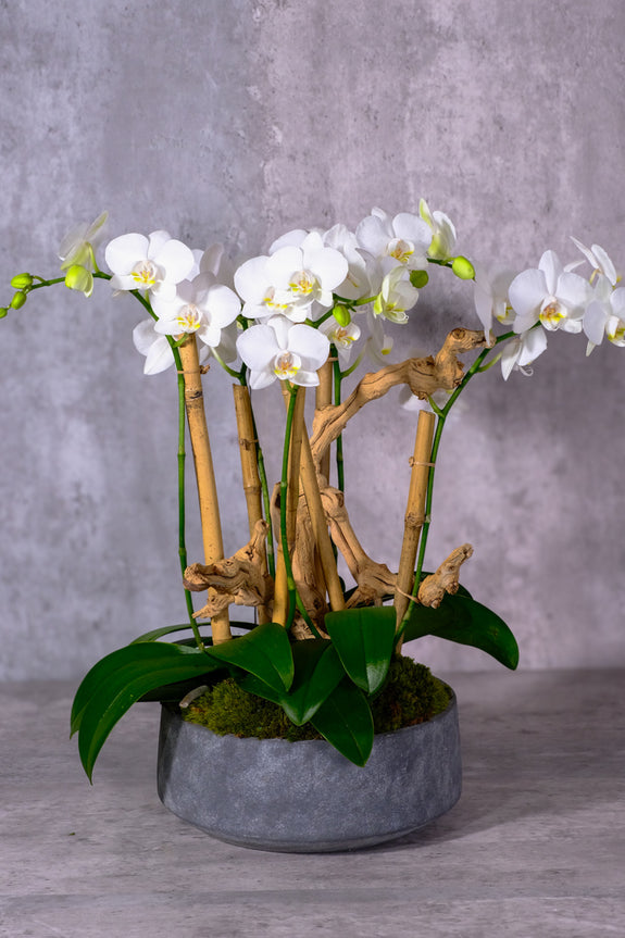 A vision of pure sophistication with its trio of double baby phalaenopsis orchids with pristine white blooms, evoking a sense of serenity and understated luxury. The fresh moss at their base further accentuates the clean, crisp aesthetic while bamboo stakes support each stem of the plant. It is thoughtfully arranged in a simple yet chic vessel with a grey marble finish. An ideal expression of refined taste for any occasion or a graceful addition to your own sanctuary.