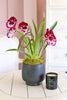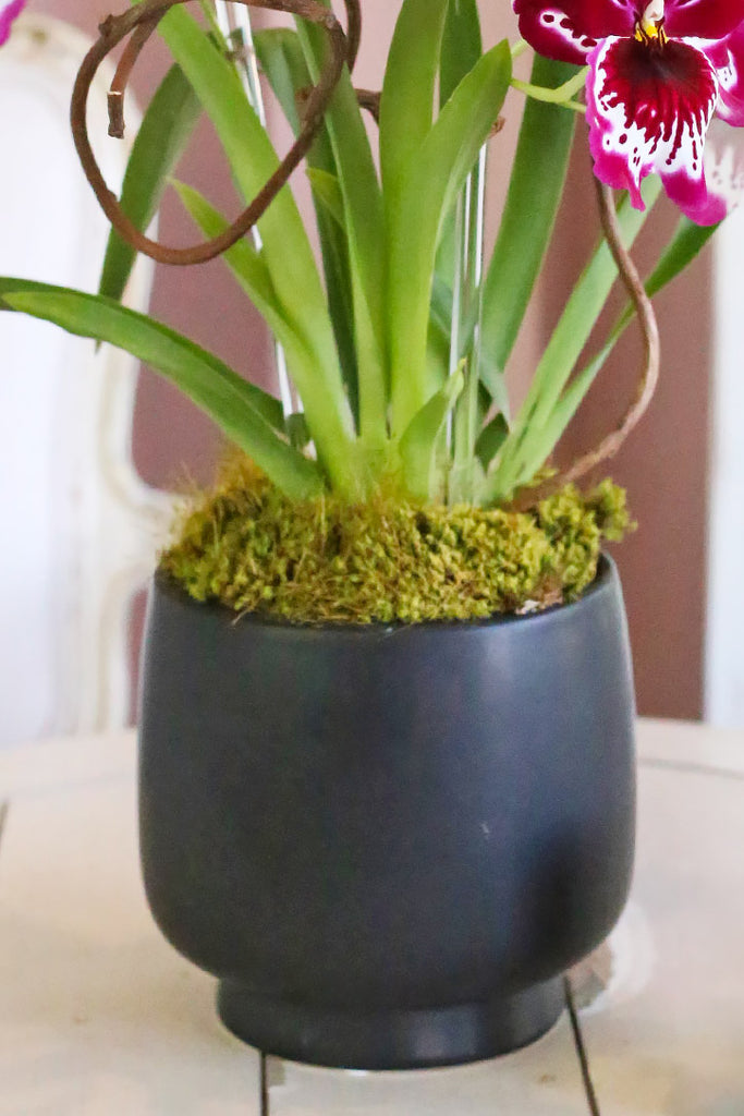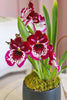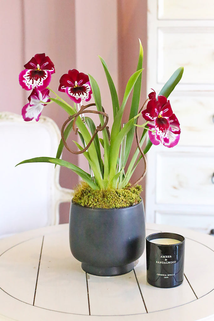 Bring bold tropical elegance into your space with this striking specialty orchid arrangement featuring vivid magenta pansy orchids in full bloom. Housed in a modern matte black vessel, these exotic blooms are grounded by a lush bed of moss and accented with curly kiwi vines for a dynamic touch. A luxurious gift for any orchid lover or as a fitting standout centerpiece.