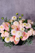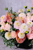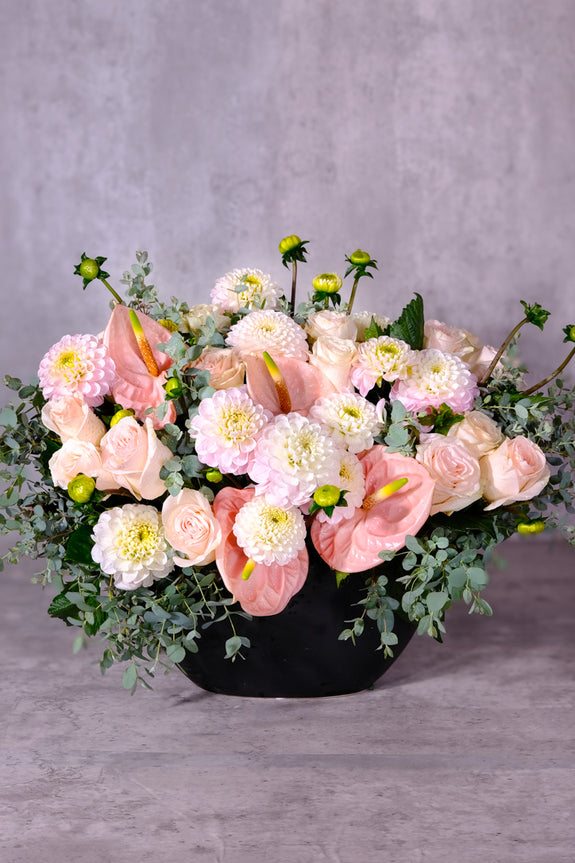 A pretty in pink and oh so chic floral arrangement that’s guaranteed to make anyone blush. Dainty pink dahlias, with their intricate petals, gracefully mingle with the sleek, heart shaped anthuriums. Soft hues of light pink roses add a classic touch, while sprigs of gunni eucalyptus create silvery-green contrasts. This dreamy and undeniably romantic arrangement is poised in a classy black vase and is perfect for Mother’s Day or any moment worth celebrating.