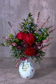 A thoughtfully curated floral arrangement that blends striking and graceful elements to create a unique expression of love. This breathtaking display of bold hot pink peonies commands attention, accompanied by sprinkles of sky blue tweedia. Darling pink lepto and deep wine hellebores provide a sophisticated depth. It can be a memorable floral gift to your dearest mom or anyone you hold near and dear. All styled in a dainty spring-inspired vase.