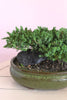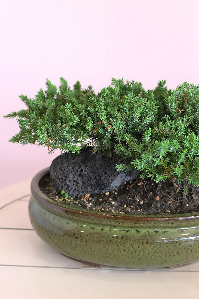 Escape to a miniature world of tranquility. This captivating piece features a juniper bonsai, meticulously styled to create a sense of harmony. Its vibrant green foliage cascades gracefully over the rim of a shallow olive-green ceramic vase, evoking a sense of a lush, verdant landscape. A single, contrasting black rock sits nestled amongst the roots, adding a touch of drama and grounding the composition. The interplay of colors and textures creates a calming oasis that brings a touch of nature's beauty indoors.
