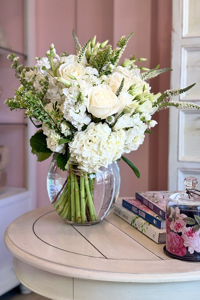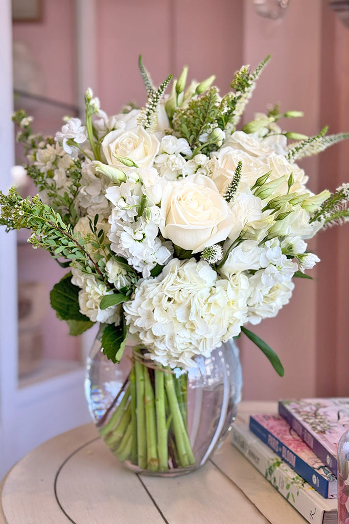 Float into a dream with this heavenly floral arrangement that captures the essence of bliss and tranquility. This all-white floral ensemble features creamy white roses, pillowy hydrangeas, elegant lisianthus, delicate spirea, stock, and wisps of veronica. Each bloom was thoughtfully chosen to evoke a sense of serenity and artfully arranged in a clear glass vase – perfect for weddings, celebrations, or simply adding a touch of beauty to any space.