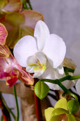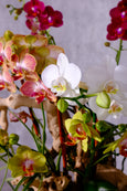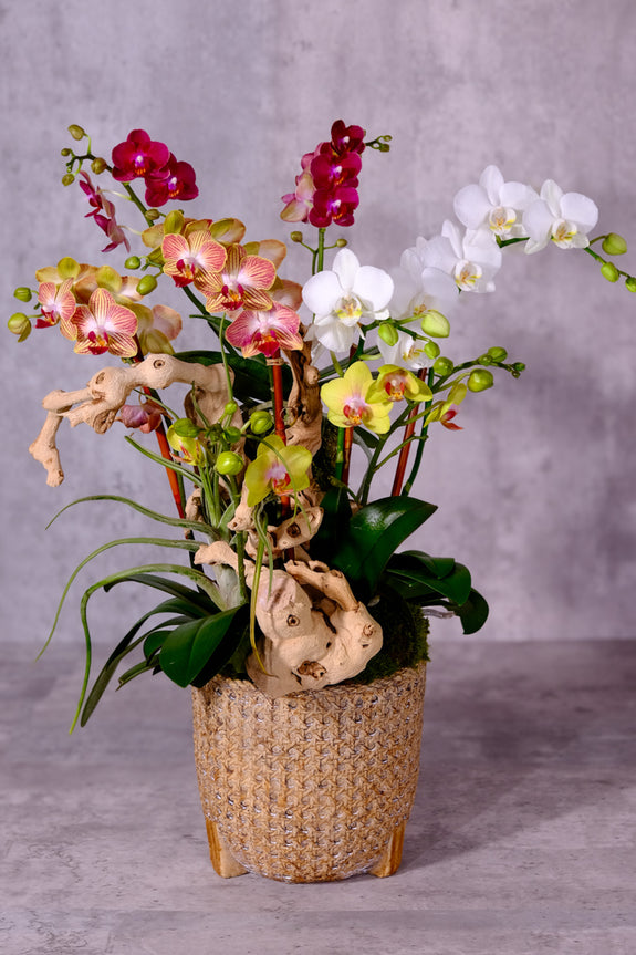 Experience a sweet island getaway through this vibrant baby orchid arrangement. It captures the untamed beauty of a sun-soaked eden with phalaenopsis blooms in hues of sunny yellow, warm coral, watermelon pink, and coconut cream white. Accented with sculptural driftwood, a feathery air plant, and fresh moss for ground cover. It has bamboo stakes to support each stem and is housed in an earth-toned pot with a woven basket design that completes the relaxed island vibe.