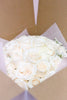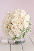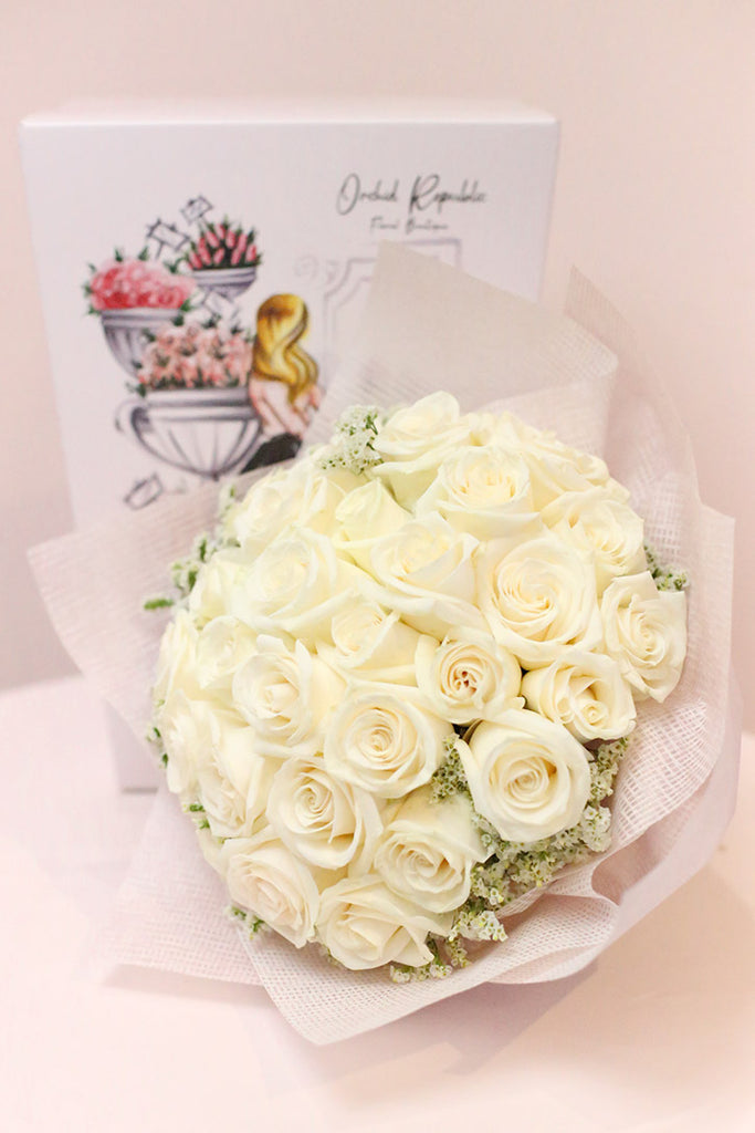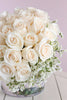 A gorgeous floral arrangement featuring creamy white Vandella roses accentuated with a cluster of white limoniums on the side. This harmonious symphony of textures and hues evokes a sense of peace and purity, making it a perfect gift for moments of reflection and sympathy or to lend understated sophistication to any space.