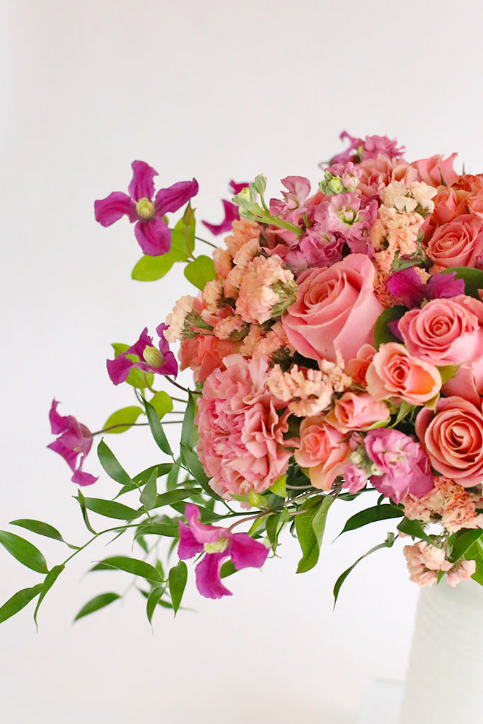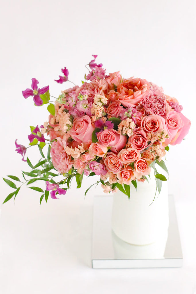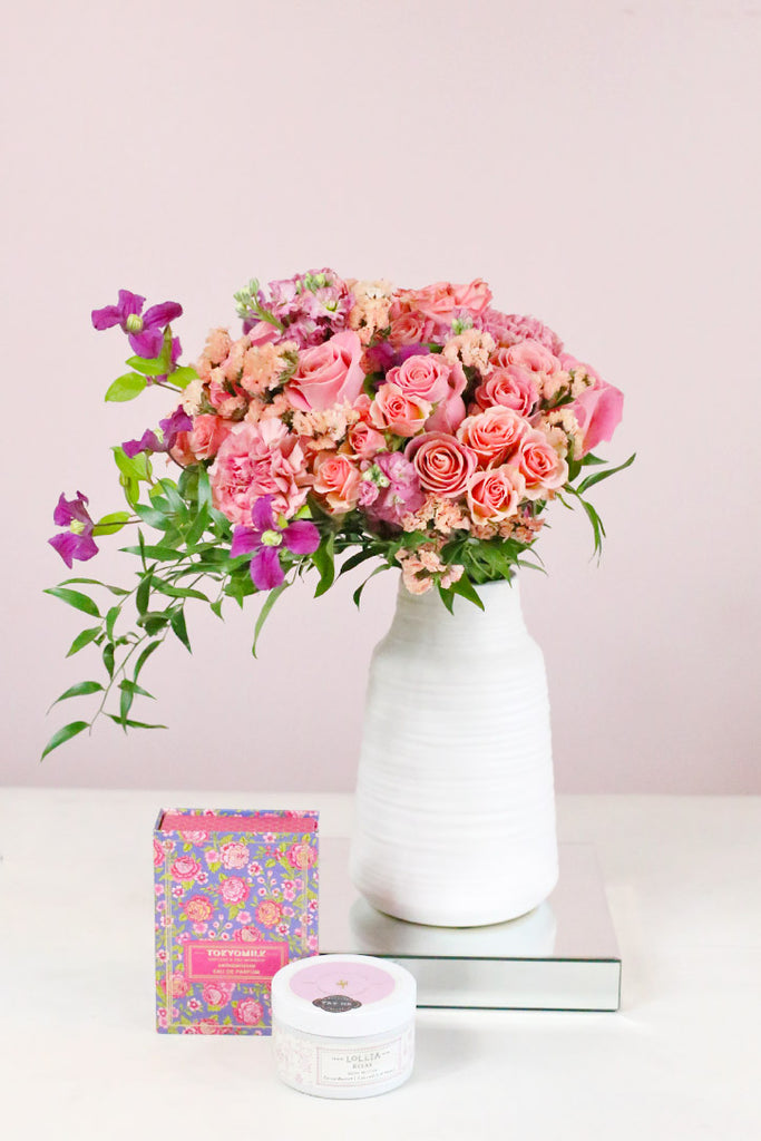 A blissful floral arrangement featuring fresh blooms in a beautiful blush pink hue. It comes with the sweetest mix of garden roses, spray roses, spray roses, stock, and a spray of clematis all nestled in a stylish, creamy white ceramic vase.