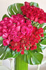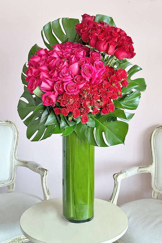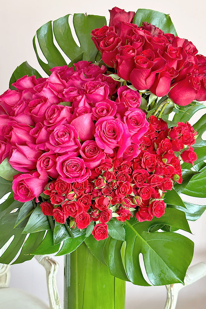 A scene-stealing display of love and desire. This romantic piece boasts a grandiose design incorporating three big and beautiful rose bouquets in pink and red with glossy green monstera leaves for a gorgeous backdrop. An irresistible gift for celebrating your significant other’s birthday or your couple's anniversary, this masterpiece comes in a tall glass vase.
