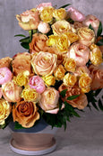 A sumptuous floral arrangement that radiates warmth and a sense of indulgent comfort. It has a captivating blend of plush roses featuring the warm, earthy tones of mochaccino and golden-hued caramel macchiato roses, beautifully complemented by baby pink and creme roses. It is accentuated with glossy, dark green foliage of gardenia leaves and rich ruscus. Set in a contemporary tri-colored pot, it can be an excellent centerpiece for elevating any space with refined charm.