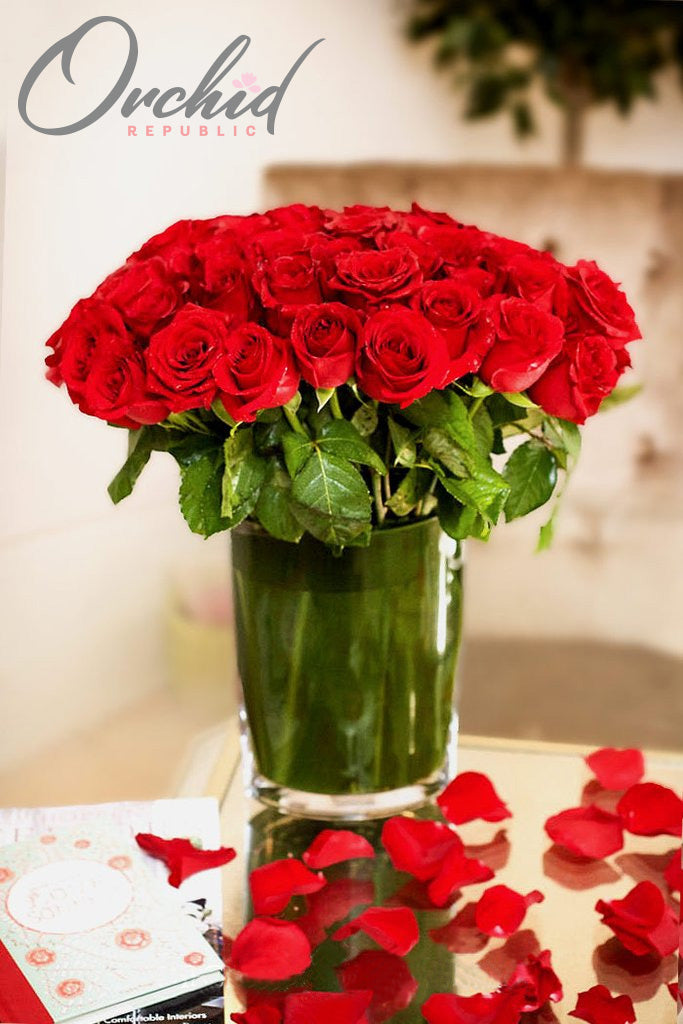 This is a classic arrangement, where 45 to 50 red Ecuadorian Roses are bundled up gracefully and held simple, in a large clear vase. The Roses are made to speak for themselves. Wooing comes easy with the number of Roses used in this arrangement.