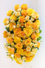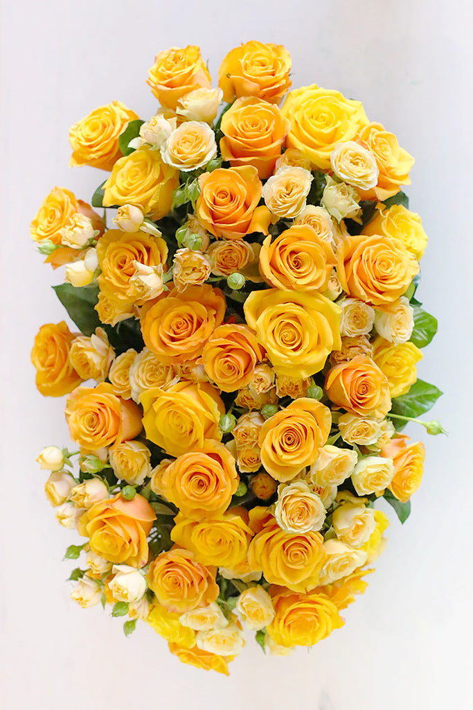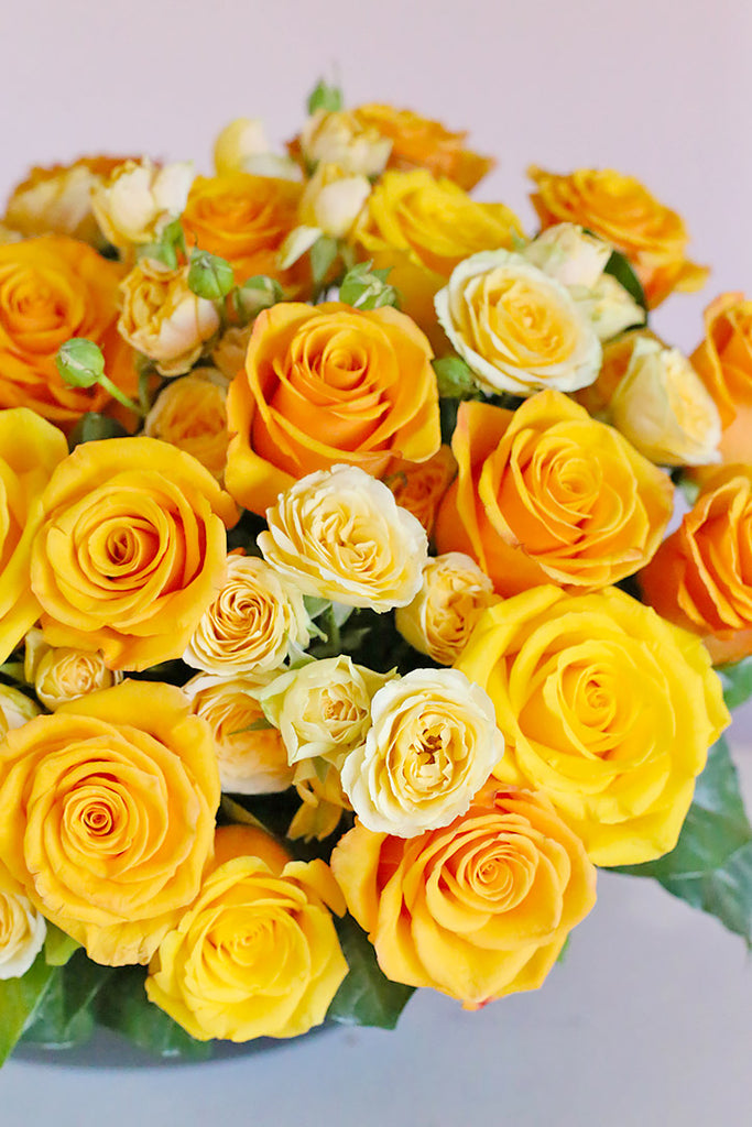 A beautiful masterpiece featuring regular roses and spray roses of varying shades of yellow nestled in a large, black vase, creating a powerful contrast. In the language of flowers, yellow stands for happiness, friendship, and celebrations.