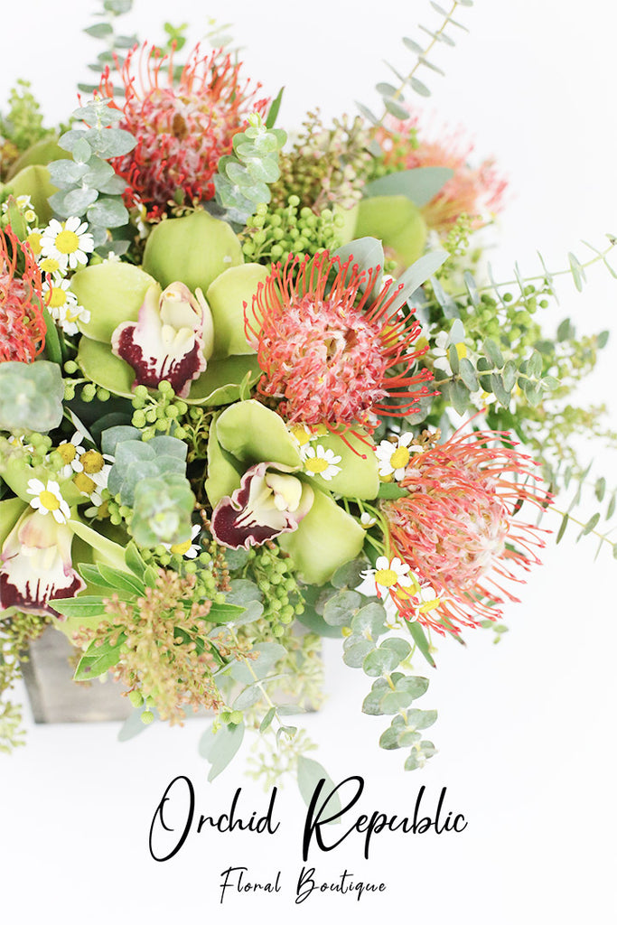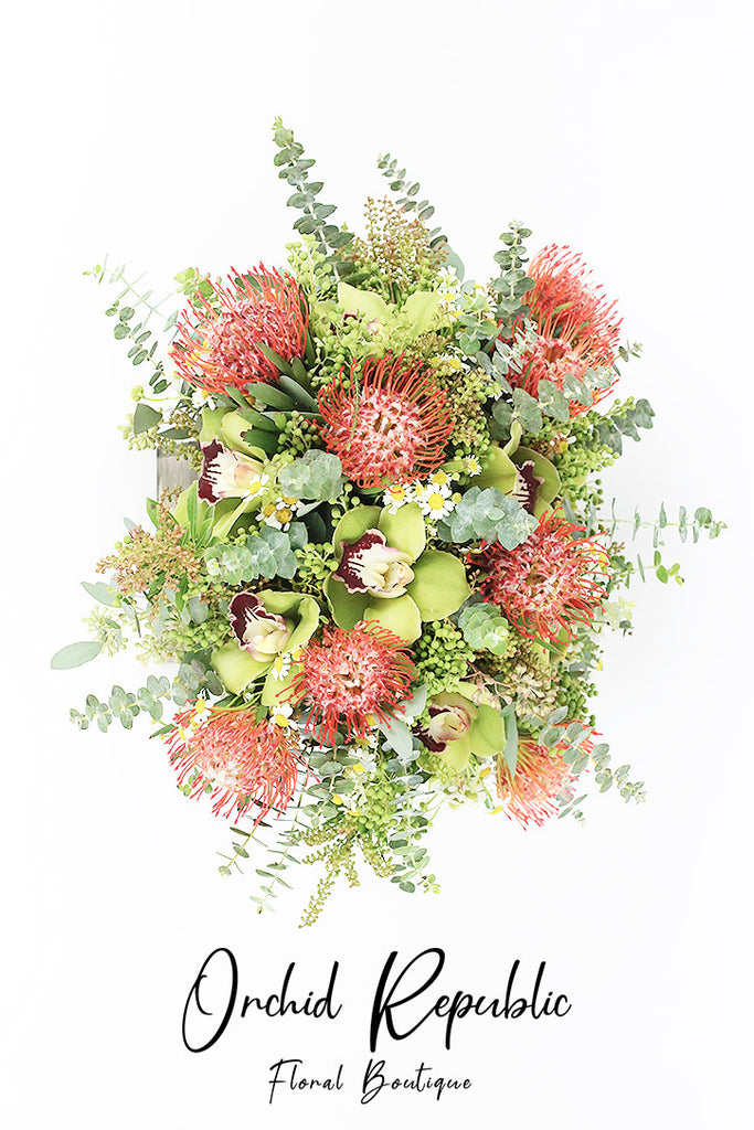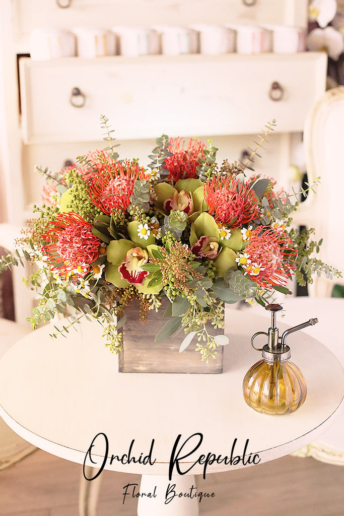 A beguiling beauty, this fresh flower arrangement blooms with gorgeous green cymbidium orchids with a hint of red on the lips and pincushion protea in striking vermillion. It comes in a rustic planter ready for gifting for all occasions.