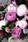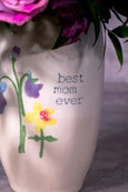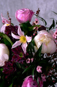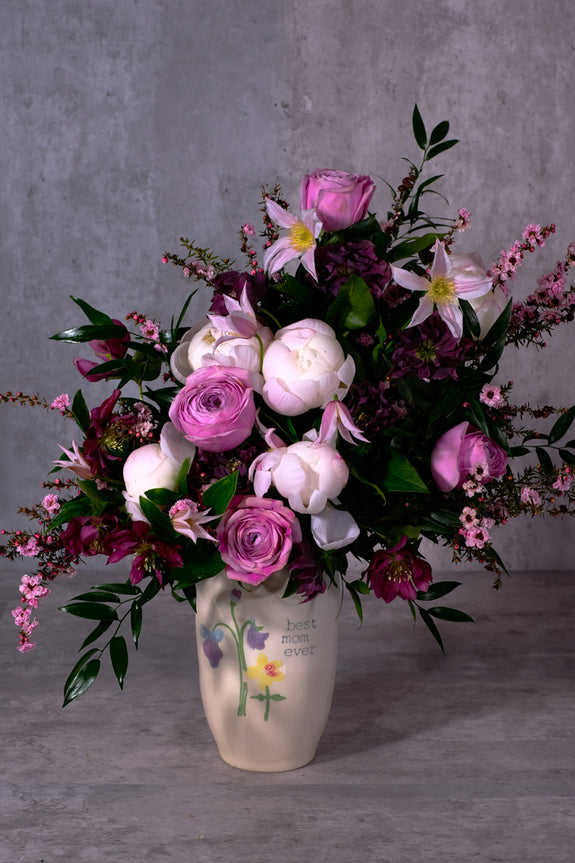 Especially made for Mom, who is simply the best! A stunning floral arrangement to match her radiance and sophistication. Showcasing dreamy peonies in serene white and dusty pink peony kiss roses as its focal point. Deep wine hellebores and lepto provide a touch of luxurious contrast, while pink clematis and fresh ruscus add a layer of visual interest. This well-designed piece is housed in a keepsake vase stamped with “best mom ever,” a gift for the mom who deserves nothing less than everything.