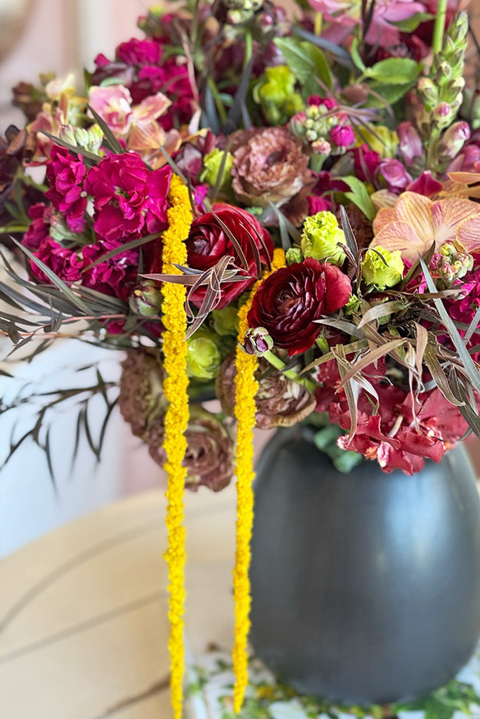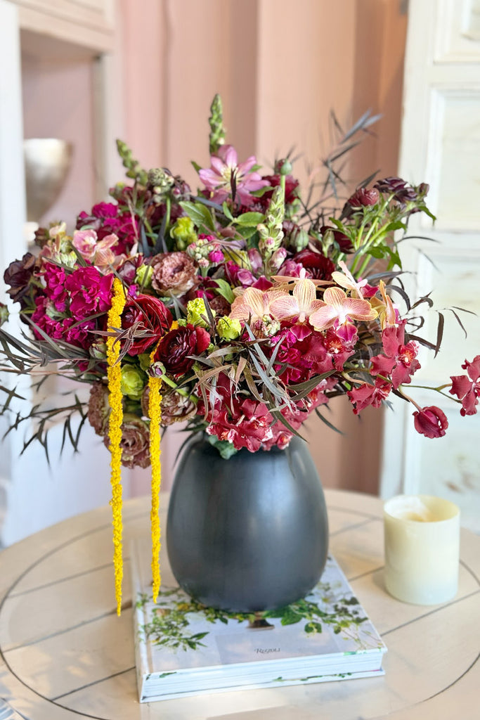 Bold, seductive, and impossible to ignore, this floral masterpiece stirs the senses and captivates the soul. A dramatic floral arrangement featuring rich burgundy butterfly ranunculus and snapdragons, paired with the fiery allure of orange phalaenopsis and wine-colored intergeneric orchid blooms. Hazel lisianthus and red ranunculus adds lush romance, while pink hellebores and hot pink stock infuse the design with feminine energy. Surrounded by stems of black gunni eucalyptus and housed in a sleek onyx vase, it evokes mystery and passion, perfect for those who crave beauty with an edge.