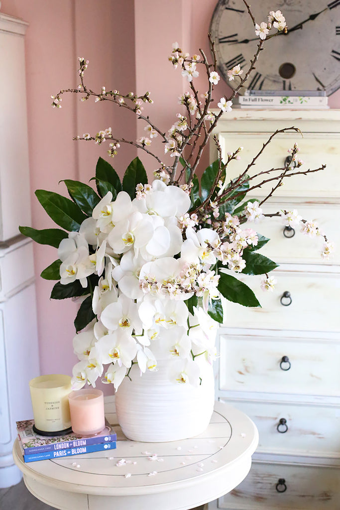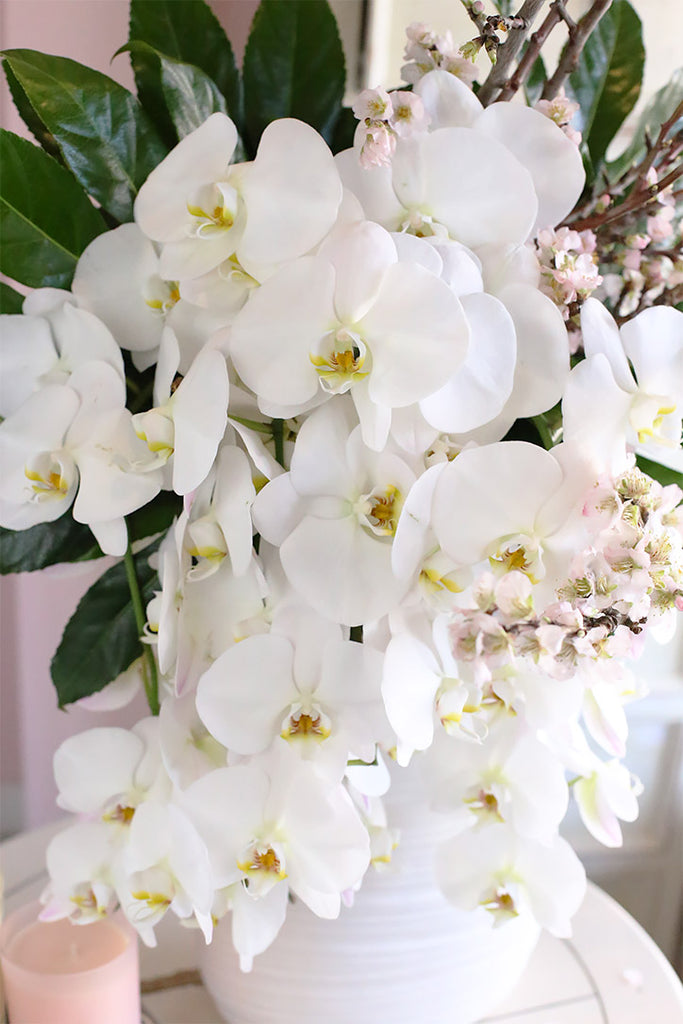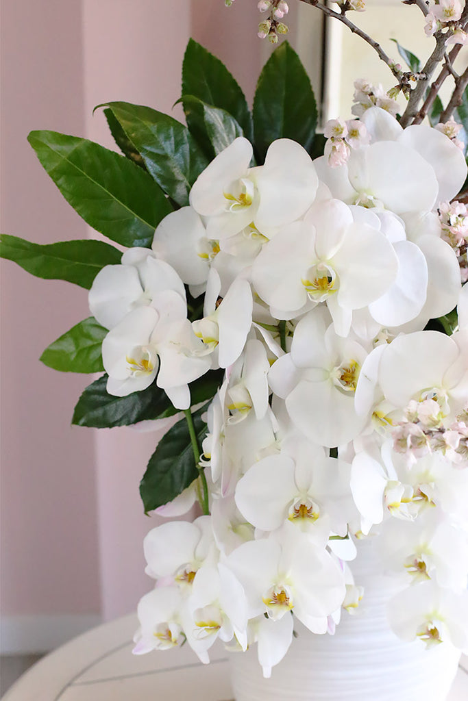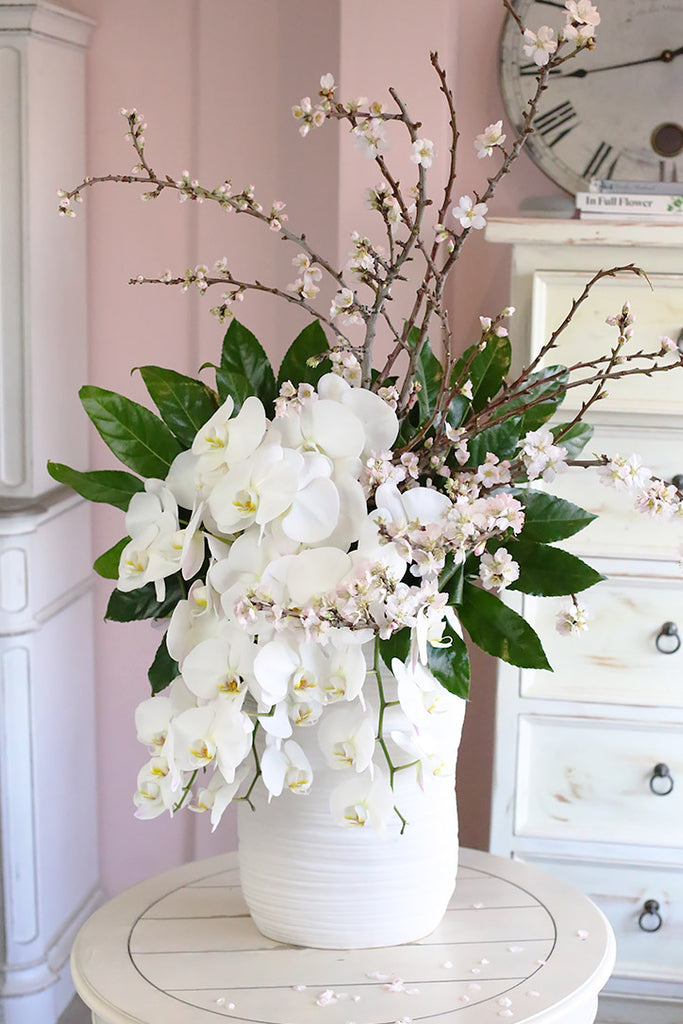 The arrangement Snowfall in Spring conveyed the message we sent. The Cherry Blossoms with the exquisite Orchids that were falling like a waterfall and the dark green leaves framing the flowers was so very beautiful! Thank you Brenda