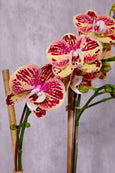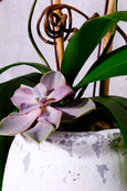 Brighten up your day with this gorgeous arrangement. Featuring a double medium phalaenopsis orchid, its petals mesmerize in a swirl of pink and yellow hues reminiscent of the citrusy tones of sweet strawberry lemonade. Adorned with smooth pebbles, a calm and collected succulent, and a playful twist of curly kiwi. It’s a zesty, cheerful display that’s sure to add a pop of life and color to any space. This piece is presented in a white shabby-chic pot with bamboo stakes supporting each stem.