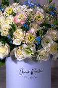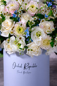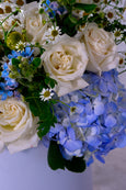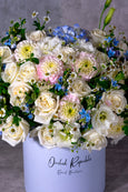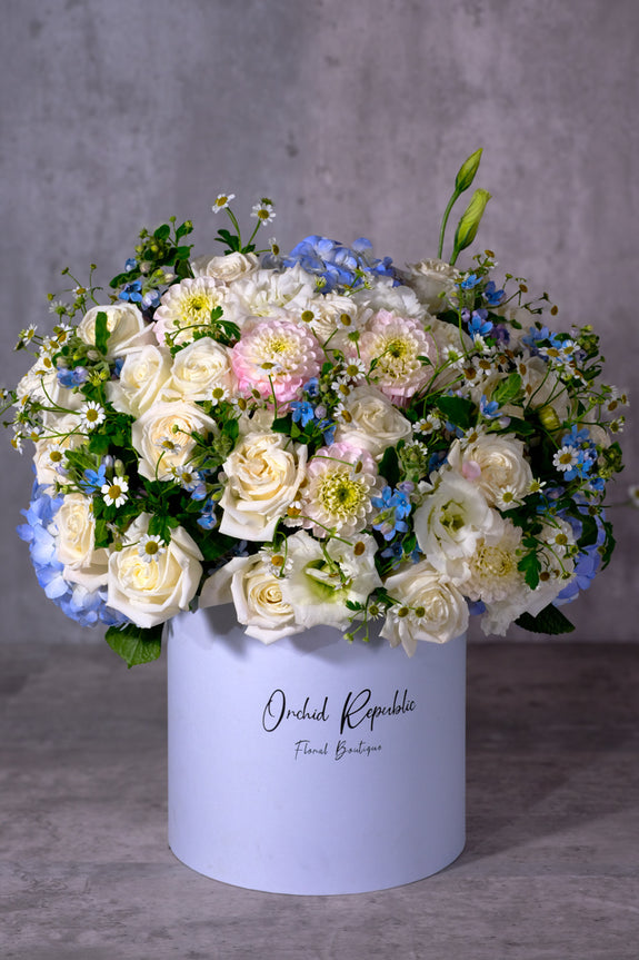 An exquisite floral composition that whispers of gentle devotion and unwavering care. This charming arrangement showcases creamy white playa blanca roses, the soft blush of pink dahlias, and the delicate clusters of powder blue hydrangeas. Sprinklings of airy blue tweedia and elegant white lisianthus add delightful depth to this serene floral display. All of this is presented in our signature hat box which doubles as a cute keepsake after the blooms have faded.