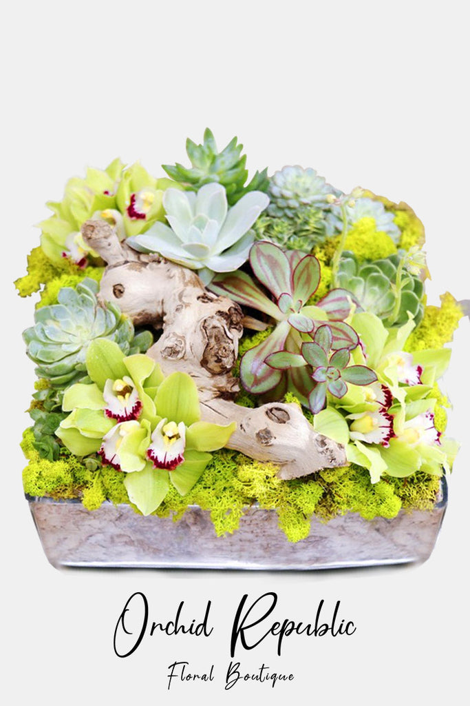 A lush little paradise brimming with beautiful rosette-forming succulent varieties adorned with exquisite cymbidium orchids in green, moss, and a piece of natural wood. This breathtaking succulent arrangement is presented in stylish square-shaped planter made of glass.
