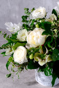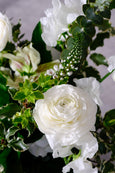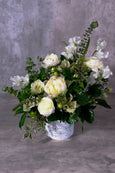 A tribute to a mother’s unconditional love. Just like her heart, this exquisite all-white floral arrangement overflows with purity and grace, featuring the luxurious blooms of creamy white peonies and ranunculus, complemented by the delicate beauty of white hellebores and sweet peas. This thoughtful expression of gratitude to the women with the purest of hearts is housed in a chic white vase with an intricate lace pattern.