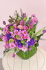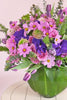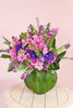 A premium floral arrangement woven with the enchanting colors of twilight. This dramatic piece features exquisite, bold blue vanda orchids standing out in the midst of mesmerizing mix of purple and lavender spray roses, poppies, tulips, Clooney ranunculus, and fragrant lilacs nestled in a stylish glass vase lined with ti leaves.
