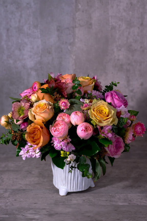 A captivating floral arrangement designed to convey your deepest affections. This colorful display features a sweet symphony of hues and textures. Adorable pink strawflowers and roses, elegant dusty pink roses, and the warm, inviting tones of caramel macchiato and mochaccino roses. Accented by purple hellebores and dainty pink stock, and is carefully arranged in a white ceramic vase with a faux bois design. This can be a heartfelt gift for moms who give their unconditional love or to simply show someone how much you care.