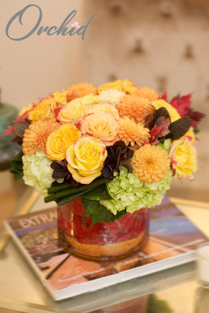 The quintessence of the season’s true beauty, this fall-themed flower arrangement features a lavish combination of decorative dahlias, garden roses, hydrangeas, and an assortment of fancy foliage in unique shades of crimson and gold.